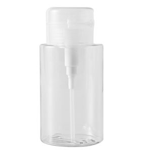 It’s made of plastic. The liquid push down pump dispenser empty bottle is perfect for liquid dispensing on cotton ball, swabs, brushes. There are no wording on the bottle, absolutely clear. You need to pour liquid into the empty bottle before you use, then just open the cap and press the pump to get liquid out. It can be used for alcohol, nail polish remover, makeup remover, etc. Capacity is 200ml(7oz).
