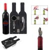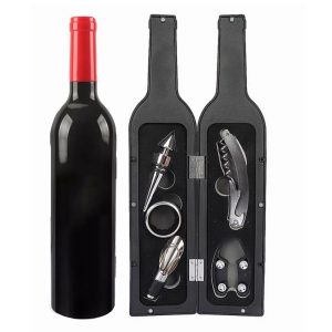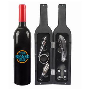There are 1pc multi-functional hippocampus knife, 1pc wine stopper, 1pc foil cutter, 1pc aerator pourer, 1pc drip ring all displayed in a wine bottle shaped gift case. The wine bottle opener is made of stainless steel and heavy-duty aluminum alloy and each piece of this set is fully able to handle anything with ease. The opener is compatible with all wine bottle sizes. There is imprint space to imprint your logo.
