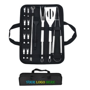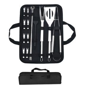 16 Piece barbecue set with carrying case. The length of barbecue needle is 13.97″. The length of the steel stick is 2.56″. The length of barbecue brush is 8.26″. The length of the barbecue clip is 13.46″. The size of the barbecue fork is 13.78″ x 1.37″. The size of the barbecue shovel is 13.57″ x 3″. It is made of stainless steel, safe and hygienic. It has a portable bag, convenient to carry barbecue products out. Suitable for outdoor barbecue.