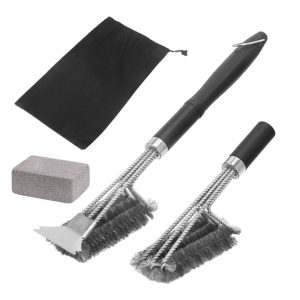 No wire bristles at all, no melting like nylon grill brushes. With this safe grill brush and scraper, your food will stay 100% bristle free. No more worry about swallowing some metal pieces. Let’s free to gobble up some favorite barbecue! Equipped with replaceable cleaning brush head. There are two brushes. Its long handle saves labor and time. Front stainless steel scraper can remove caking stains.