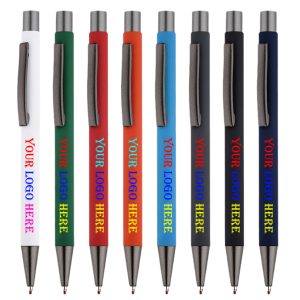 The Business ballpoint pen has a steel barrel with brass rings, and the refill color is black and writes smoothly.