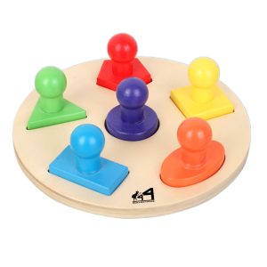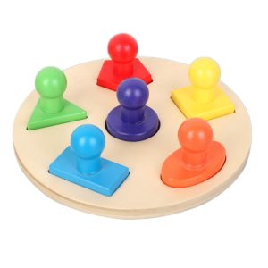 The Early education fun toy is made of wood, using environmentally friendly water-based paint, smooth and burr-free. It contains six geometric wooden blocks and a one-to-one correspondence with the wooden blocks of the base.
