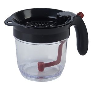 Gravy fat separator is made of heat-resistant and food-safe plastic that can withstand the heat of roasting fluids, all parts are heat-resistant, BPA-free. The black strainer on the top can quickly separate solids and fat. Fat separator has a silicone drip plug for releasing liquids, with a relaxed thumb release, you can easily separate gravy and fat.