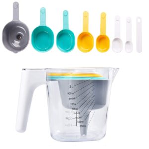 This baking 9-piece set is made of plastic and includes 1 measuring cup (1L), 1 spatula, 1 funnel and 6 measuring spoons (7.5ml, 15ml, 60ml, 85ml, 125ml, 250ml).