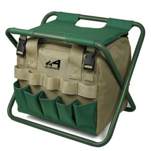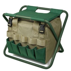 The Foldable garden stool is made of 600D oxford fabric and iron tubing. The bag under the stool has a carry handle, double-ended zip closure, quality insert fastening and 5 storage pockets.