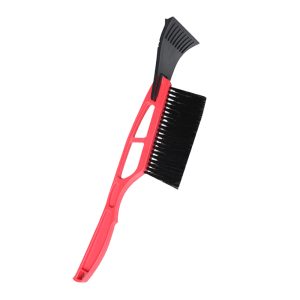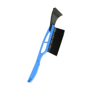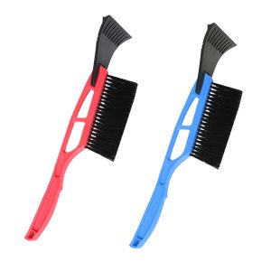 The snow scraper is made of hard plastic with nylon and ABS shovel head. The shovel head has snow guide channels and is removable. Hanging hole at the end of the handle.