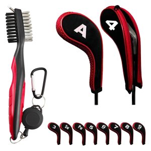 The set is composed of ten golf zipper iron covers and a golf club brush made of Plastic and PP. The brush body is made of Plastic, which is 7.48inch in length and 1.97inch in width. The bristle brush is made of PP. It is hard enough to help you clean up your golf club.