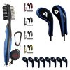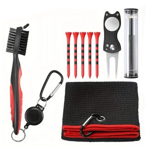 The golf set includes a towel, a brush, a hexagonal golf club groove cleaner, a green fork and five nails.