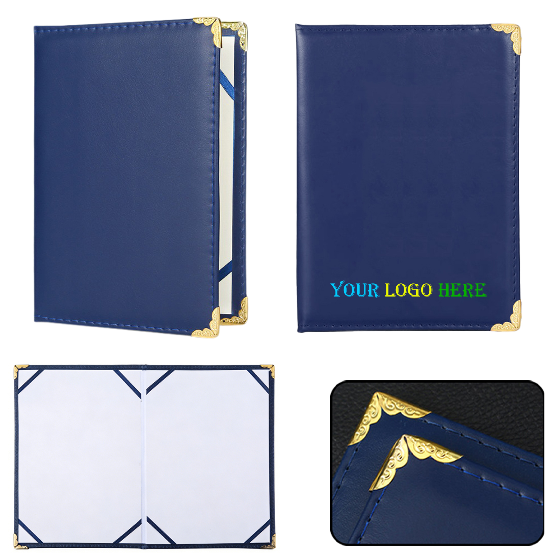 Elevate your achievements with this luxury PU leather diploma cover. Crafted from durable faux leather with ornate gold-plated corners. Cover size: 8.67″ x 12.2″ – fits standard A4 certificates (custom sizes available). Double-sided interior pockets with ribbon holders keep documents secure. Blank front supports custom logos or text – ideal for graduations, corporate gifts, or personal keepsakes. Sustainable, stylish, and timeless.
