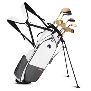 This fully waterproof golf bag is made of fiber with multiple compartments designed to hold and organize a variety of golf equipment such as clubs, balls and accessories, and is durable and easy to clean.