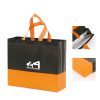 This Supermarket Folding Shopping Bag is made of non-woven fabric, the bag has side and bottom, designed with two carrying handles, and can be folded up when not in use.