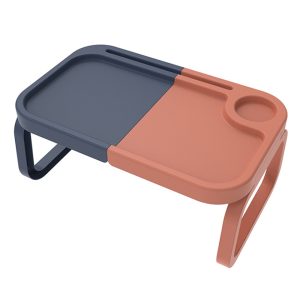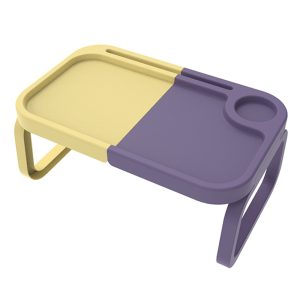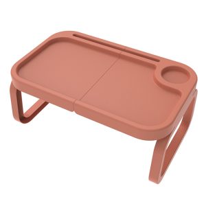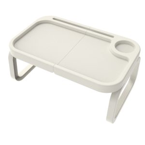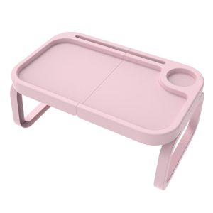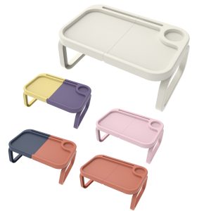 The folding computer desk is made of food grade PP. It includes card slot for ipad/phone, cup holder/pen holder and laptop area. There is a charging cable port in the card slot. Corner rounded design. The table corners can be folded.