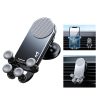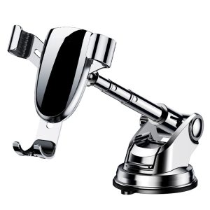 The car phone holder is made of alloy and it features a 15.5 cm retractable support bar. It can rotate 360-degree horizontally and 270-degree vertically adjustable angle. It uses nano-silicone adhesive suction cups and can support 4.5L. It is also equipped with a double triangle design and five-step anti-slip pad, which can enhance the stability of the phone and protect the phone bezel.