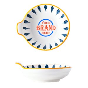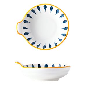 The ceramic dish is made of ceramic with an underglaze process. The bottom is not glazed. The dish comes with a handle. Daily microwave, oven, sterilizer can be used.
