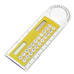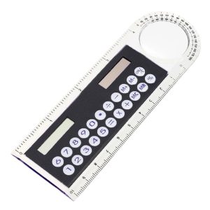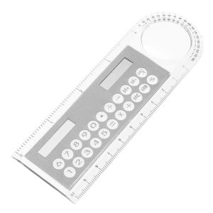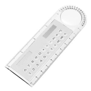 The multi-functional ruler is made of ABS material and has a built-in button battery. It contains a simple calculator, 10 cm straightedge, a mini protractor.
