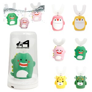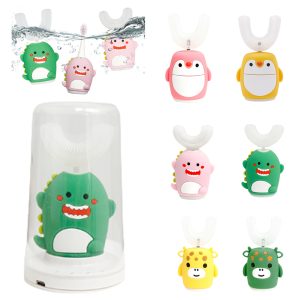 This kids electric toothbrush is made of silicone, specially designed for kids gums and sensitive teeth. It includes 1 food grade silicone U-shaped brush heads and 1 soft brush heads. The soft toothbrush head that surrounds the teeth 360 degrees provides a comfortable brushing feeling, more efficient and deep cleaning of teeth. It has 3 different ultrasonic cleaning modes, an all-round waterproof seal design and is IPX7 deep waterproof. Cute cartoon design makes the brushing process full of fun.